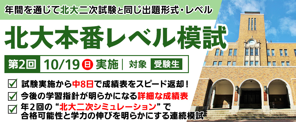 EVENTS 東岡山校 HOME » イベント情報 » 北大本番レベル模試 北大本番レベル模試 2025.09.25 東岡山校 2025-10-19 実施 東岡山校:受験者以外 11:00~18:00まで開館 通常通り開館 高2北大本番レベル模試 特別招待講習・招待状請求(講座リスト)・資料請求・無料体験・個別説明会のお申込みはこちら ツイートする シェアする LINEに送る