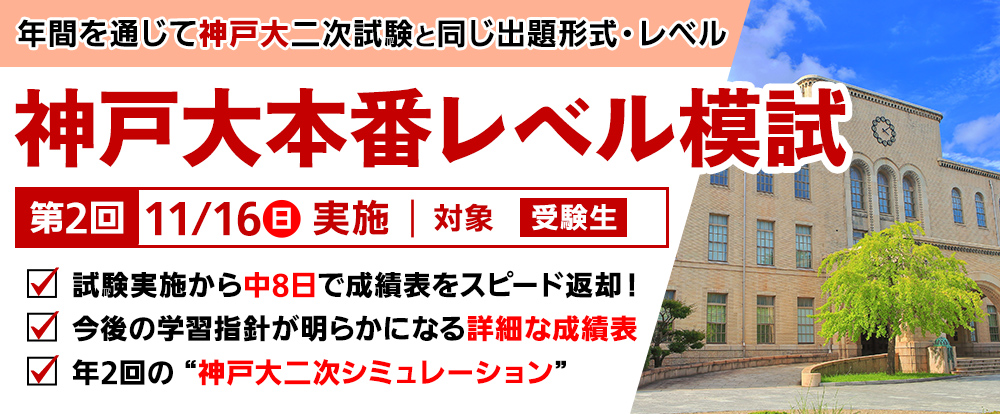 EVENTS 東岡山校 HOME » イベント情報 » 神戸大本番レベル模試 神戸大本番レベル模試 2025.10.22 東岡山校 2025-11-16 実施 東岡山校:受験者以外 11:00~18:00まで開館 千葉大本番レベル模試 全国国公立大記述模試 特別招待講習・招待状請求(講座リスト)・資料請求・無料体験・個別説明会のお申込みはこちら ツイートする シェアする LINEに送る