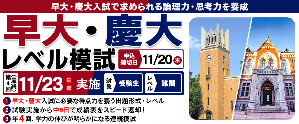 EVENTS 東岡山校岡山瀬戸校 HOME » イベント情報 » 早大・慶大レベル模試 早大・慶大レベル模試 2025.10.22 東岡山校岡山瀬戸校 2025-11-23 実施 東岡山校:受験者以外 11:00~18:00まで開館岡山瀬戸校:受験者以外 11:00~18:00まで開館 関関同立レベル模試 上理・明青立法中レベル模試 特別招待講習・招待状請求(講座リスト)・資料請求・無料体験・個別説明会のお申込みはこちら ツイートする シェアする LINEに送る