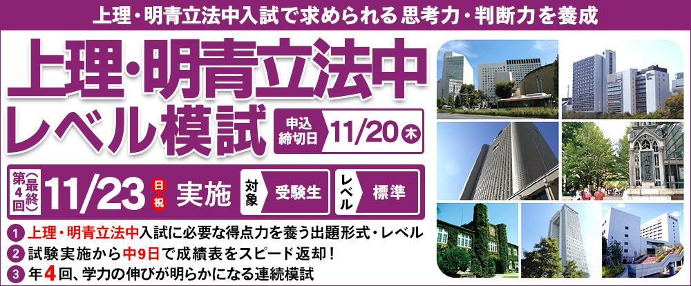 EVENTS 東岡山校岡山瀬戸校 HOME » イベント情報 » 上理・明青立法中レベル模試 上理・明青立法中レベル模試 2025.10.22 東岡山校岡山瀬戸校 2025-11-23 実施 東岡山校:受験者以外 11:00~18:00まで開館岡山瀬戸校:受験者以外 11:00~18:00まで開館 早大・慶大レベル模試 通常通り開館 特別招待講習・招待状請求(講座リスト)・資料請求・無料体験・個別説明会のお申込みはこちら ツイートする シェアする LINEに送る