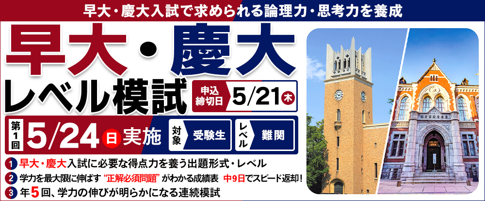 EVENTS 東岡山校岡山瀬戸校 HOME » イベント情報 » 早大・慶大レベル模試 早大・慶大レベル模試 2026.04.23 東岡山校岡山瀬戸校 2026-05-24 実施 東岡山校:受験者以外 11:00~18:00まで開館岡山瀬戸校:受験者以外 11:00~18:00まで開館 全国国公立大記述模試 上理・明青立法中レベル模試 特別招待講習・招待状請求(講座リスト)・資料請求・無料体験・個別説明会のお申込みはこちら ツイートする シェアする LINEに送る